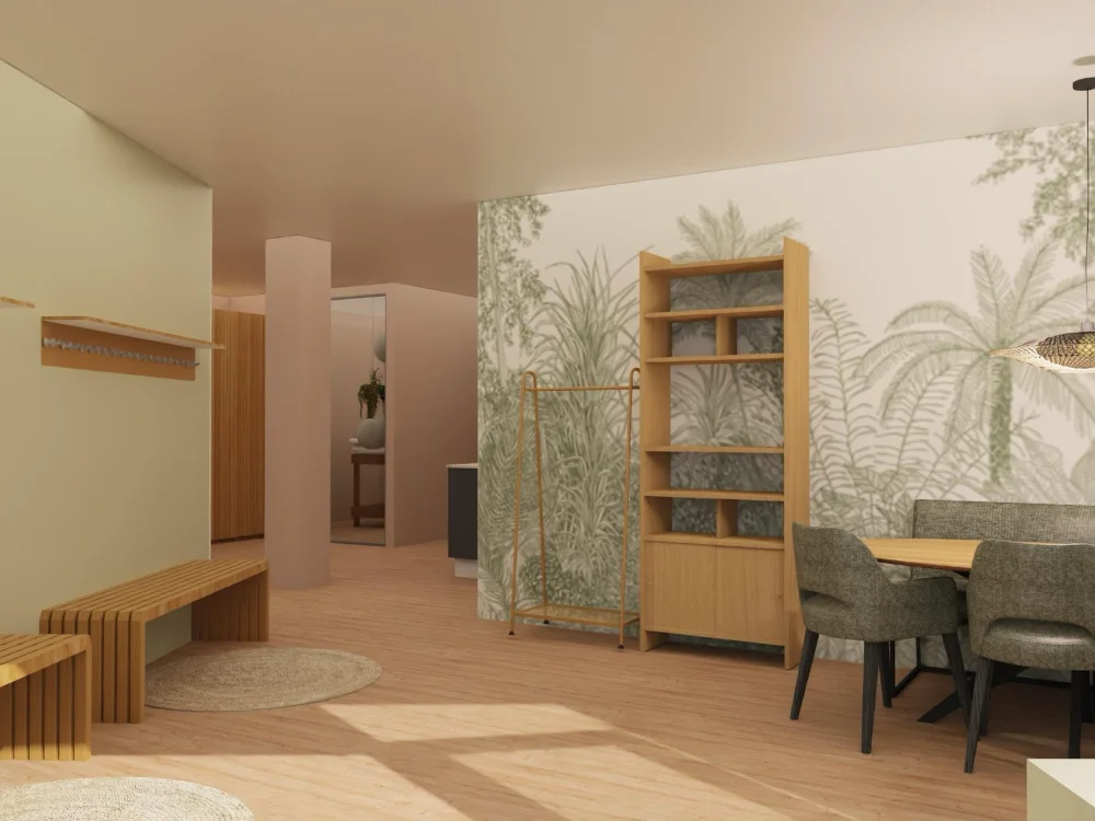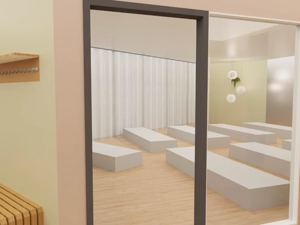 De nieuwe ingang zou in het naastgelegen pand komen, wat meteen veel beter voelde. Bij binnenkomst stap je direct de warme ontvangstruimte binnen met veel licht, waar je je spullen kunt neerleggen en rustig kunt landen voor de les. Van daaruit loop je door naar één van de studio’s voor groepslessen of een individuele afspraak. De routing werd helderder, rustiger en professioneler.