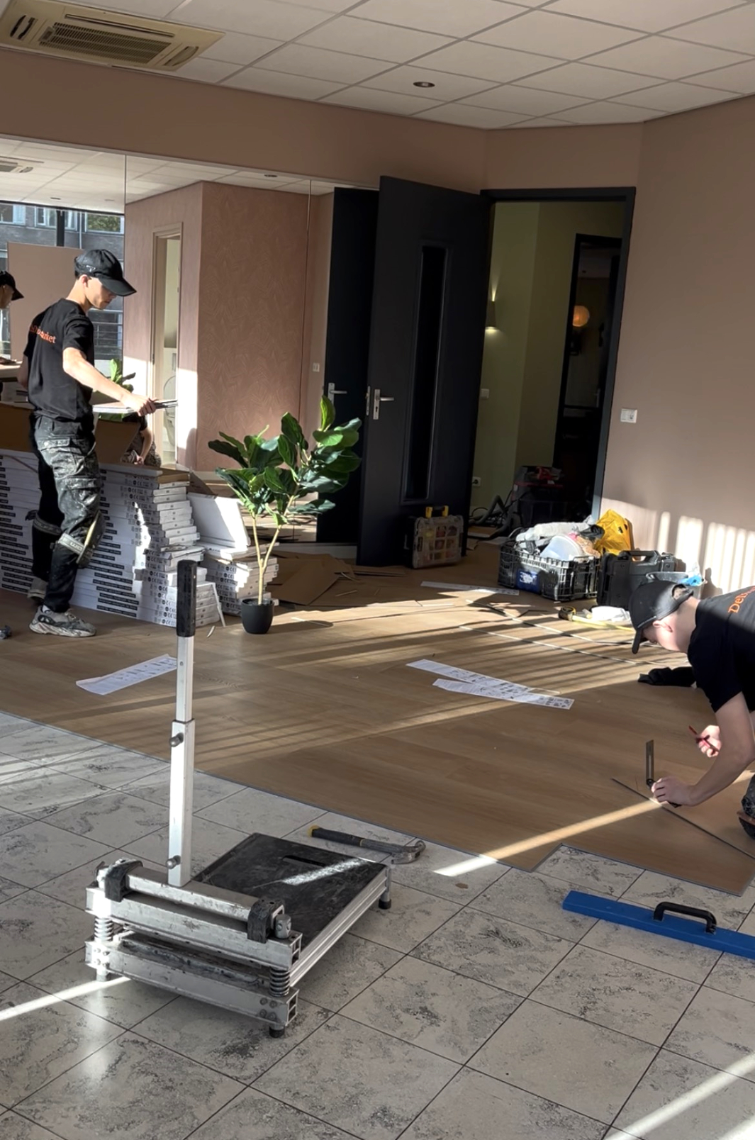 De nieuwe houtlook vloer ligt erin en we worden zó blij van het resultaat. Warm, rustig en helemaal de sfeer die we voor ogen hadden. De studio krijgt steeds meer haar eigen uitstraling — we kunnen niet wachten om hier straks samen te bewegen! ✨
